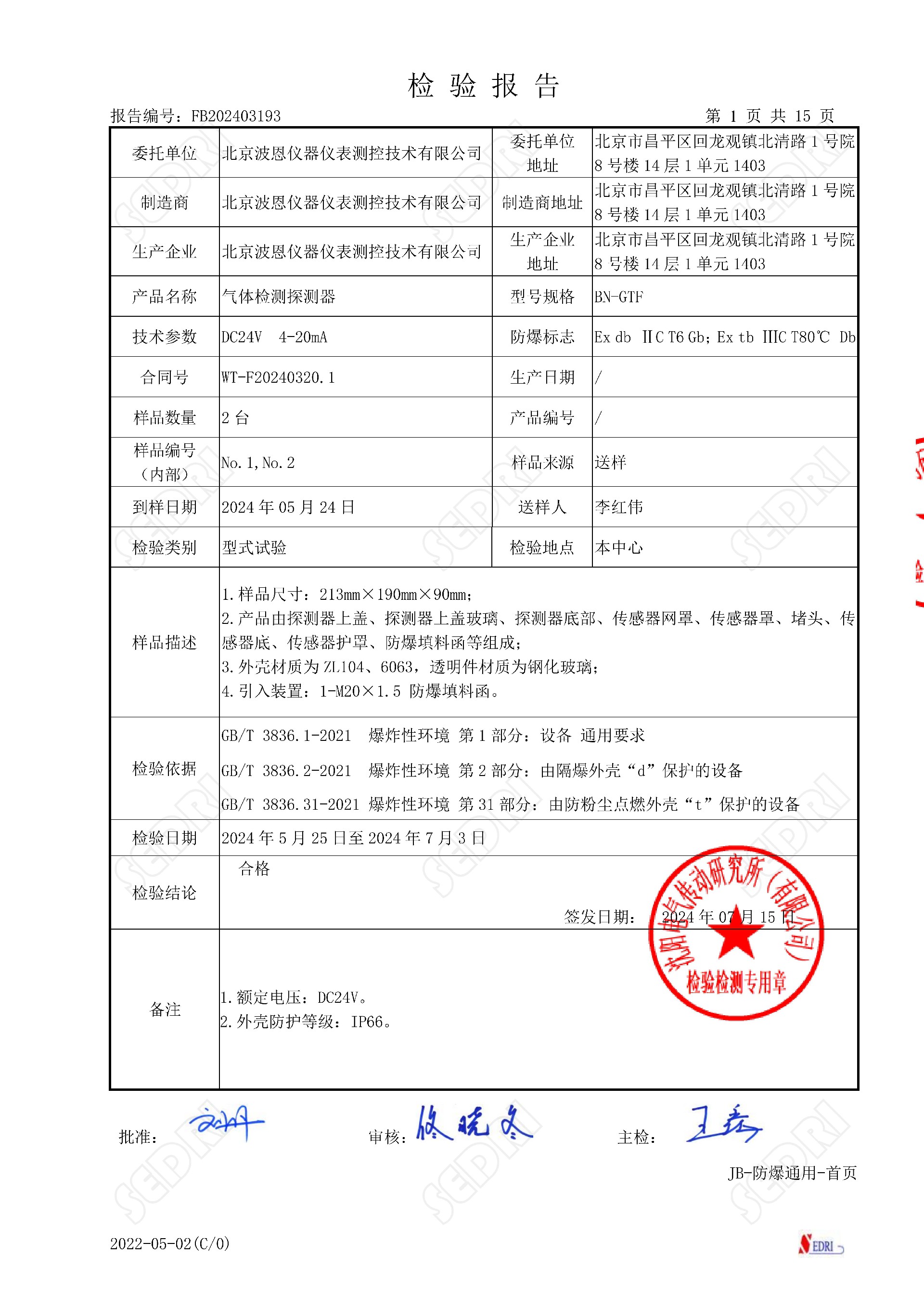 氣體檢測探測器型式試驗報告證書